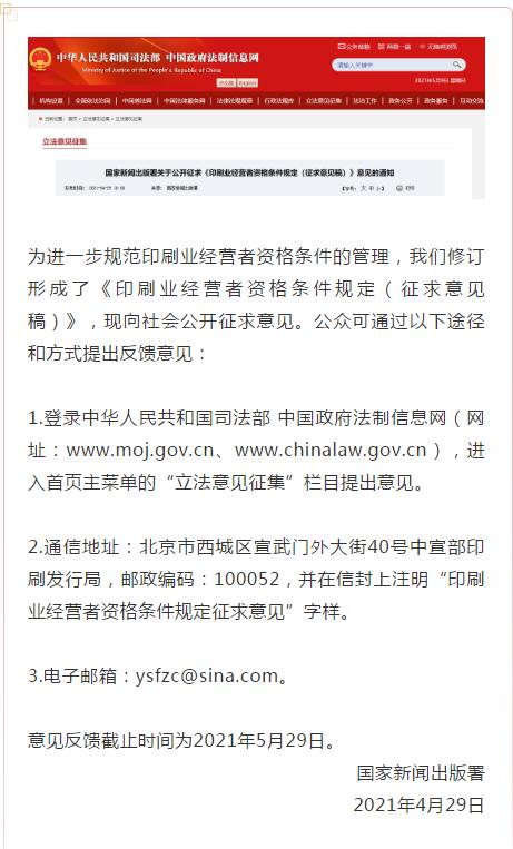 4月29日,中华人民共和国司法部、中国政府法制信息官网发布了《印刷业经营者资格条件规定(征求意见稿)》,并对该意见稿向社会公开征求意见。