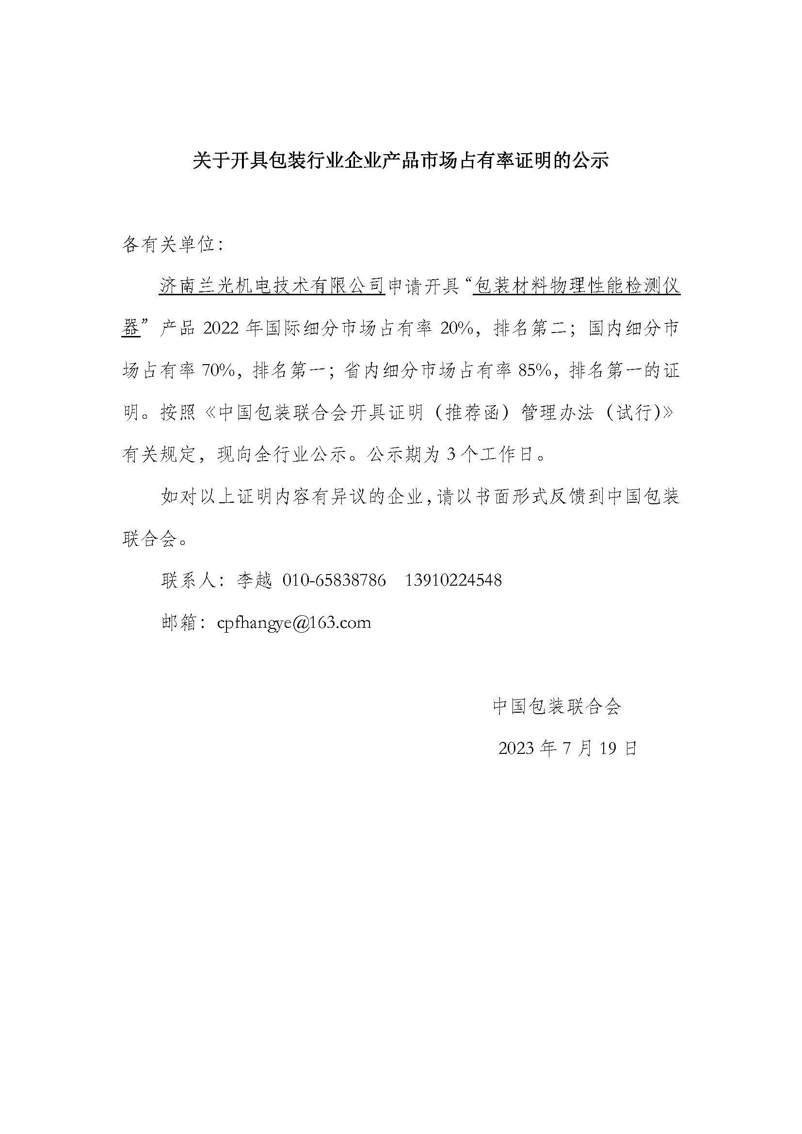 济南兰光机电技术有限公司开具包装行业证明的公示